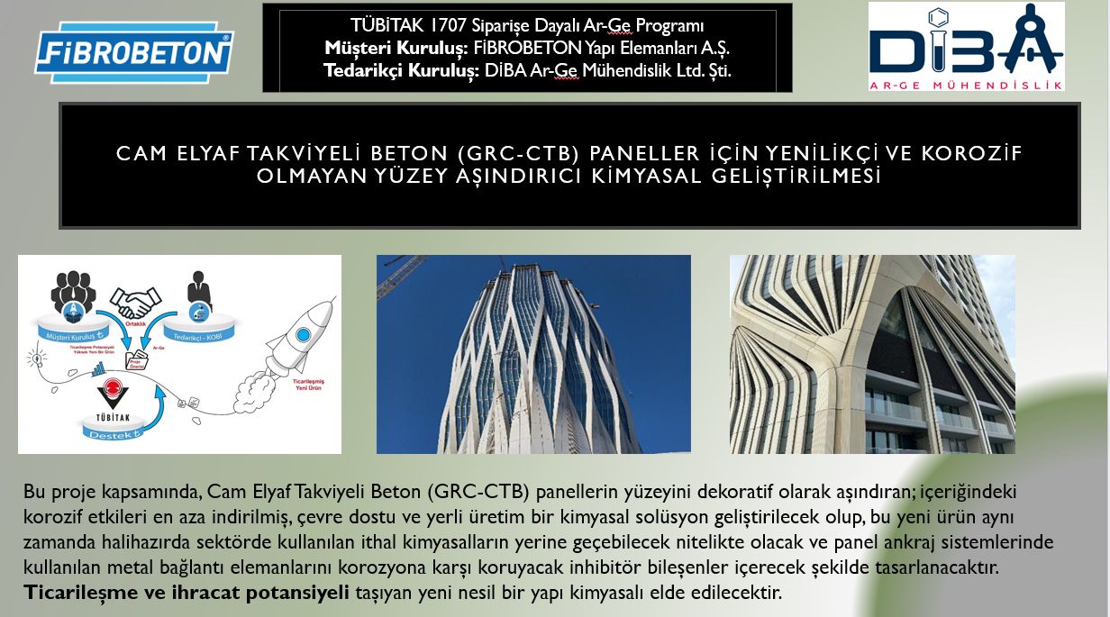 TÜBİTAK 1707 Siparişe Dayalı Ar-Ge Projesi kapsamında hazırladığımız başvuru, “Cam Elyaf Takviyeli Beton (GRC-CTB) Paneller İçin Yenilikçi Korozif Olmayan Yüzey Aşındırıcı Kimyasal Geliştirilmesi” başlıklı projemiz kabul edilmiştir.